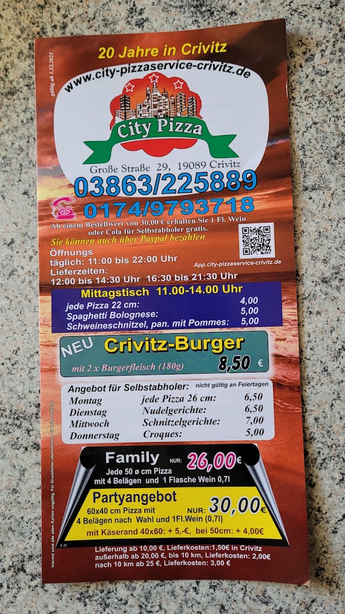 Welcome to City Pizza Service Crivitz, a hidden gem located on Große Str. 29 in Crivitz, Germany. This delightful eatery offers a diverse menu that perfectly caters to those on the go. Customers rave about the efficiency of their service, with quick turnaround times for both in-store and app orders. The food is described as deliciously satisfying, with highlights like overbackenes Gyros and Croque stealing the show.